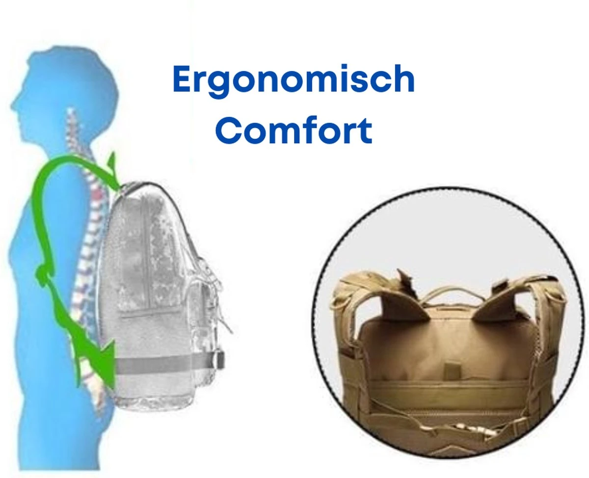 Ergonomische rugzak helpt rug- en nekpijn te verminderen tijdens een outdoor trip. Met brede gedempte, mesh vulling en ademende schouderbanden en rug, verstelbare tailleband en hoge borstband, zodat u niet gemakkelijk eraf valt tijdens het springen. U kunt de beide riemen losmaken wanneer u ze niet gebruikt. Deze outdoor survival rugzak kan uw outdoor druk verminderen en maakt u meer comfortabel en veilig.